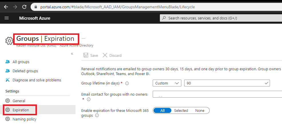 - Which groups should be afected, if all or just a selected few. Please keep in mind that if you select "All" and there are a lot of Teams which files weren't accessed in the amount of days you selected, they'll automatically get the expiration date X days in the future. If the X is lower or equal to 30 days a lot of emails will be sent to the owners warning them.